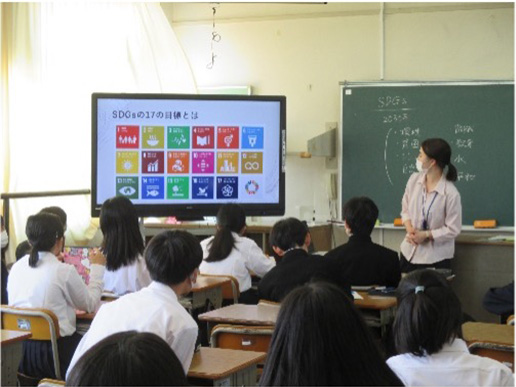 「ESD を軸とした持続可能な社会に向かう生徒の課題解決力の育成〜地域との協働学習を通して〜」をテーマとして、「松原未来学習」と「松原ローカル学習」の2本軸で、3年間系統的かつ連続性のある学習を推進している。松原未来学習とは、「Think globally, act locally」を基本的な考え方としている。昨年度、1 年生では、世界の食品ロスの問題から身近な給食の残食を減らすための方策を考え、草津市に提言を行った。松原ローカル学習では、松原中学区で多く栽培されているブランド野菜である「ベジクサ」について調べ、給食の残食減少に向けて取り組んだ。