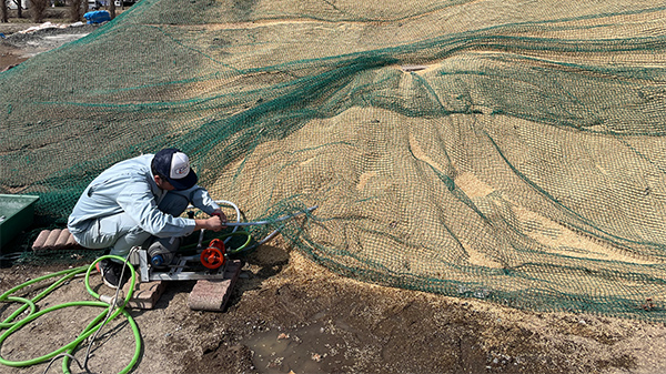 冬に降り積もる雪で雪山を造成し、その断熱材として籾殻を被覆することで夏まで雪を保存、雪冷熱として活用する。具体的には、雪山の下に通したパイプに水を流し、冷水となった水を冷媒にしてファンで冷風を創り出すことでハウス内を冷却する。また、断熱材として利用した籾殻はペレットに加工し冬場の暖房燃料として活用する。さらに、その燃焼灰はケイ酸質として翌年の水稲肥料に活用し、籾殻の循環利用による周年栽培モデルを実現させる取組である。