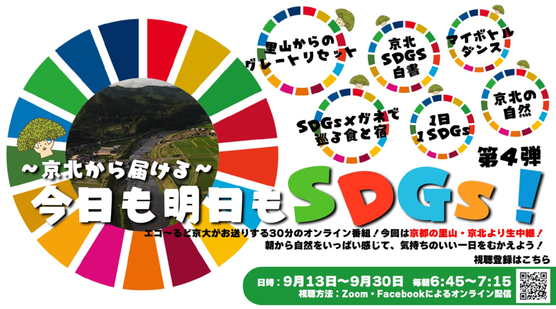 エコ〜るど京大とは、京都大学の学生と教職員からなる団体で、「持続可能なキャンパス」の実現に向けてキャンパス内外で活動を行っています。特に、プラスチックや食品ロス、SDGsに関する活動や、京都市北部の中山間地域である京北での活動を行っています。夏には、里山である京北を舞台に30分間のオンライン番組「今日も明日もSDGs!第4弾」を作成し、SDGsや京北について18日間発信しました。他にも、中高生とのSDGs学習も行っています。